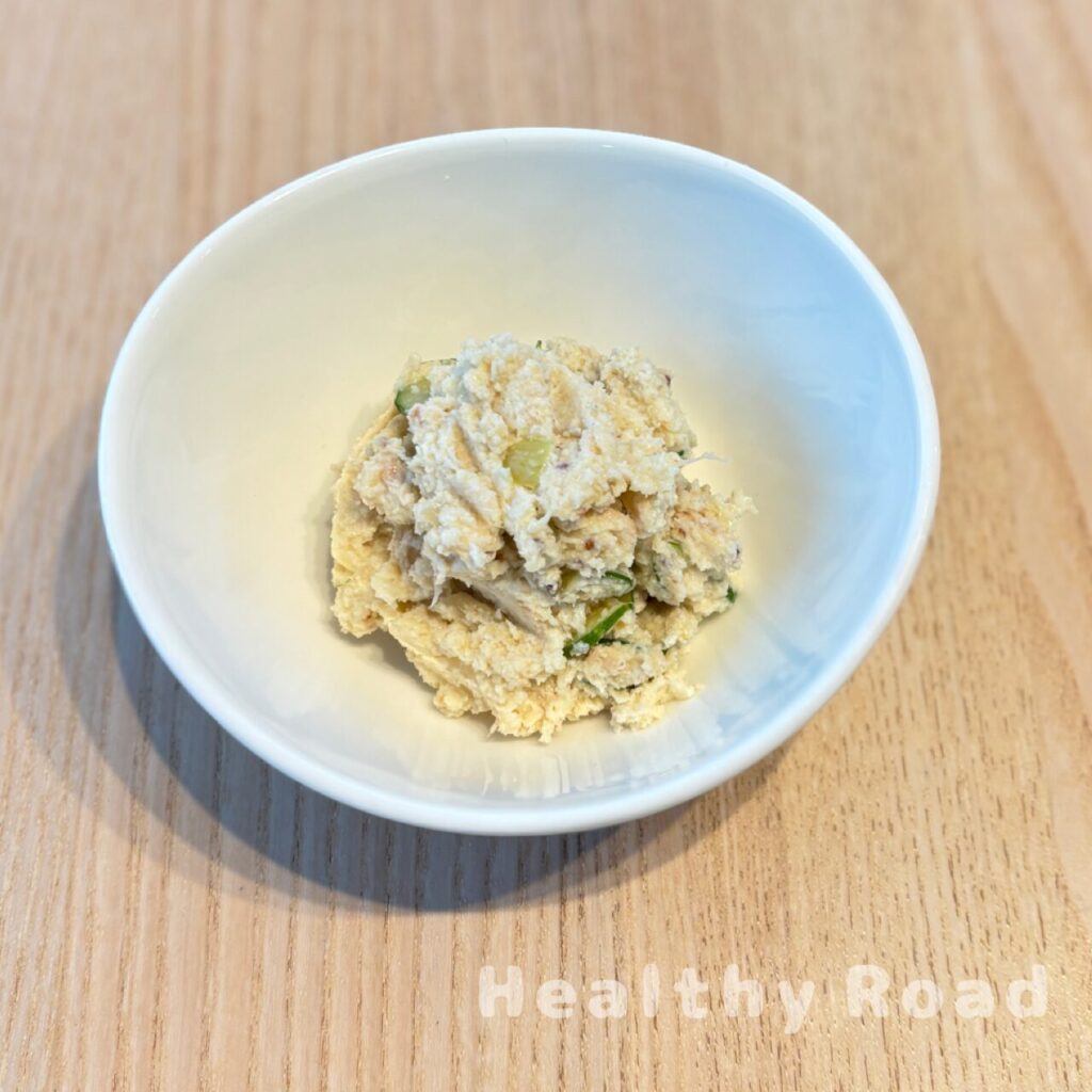 ポテトサラダに見た目がそっくりですが、おからを使っているので、糖質は少なく、たんぱく質が多いサラダです。